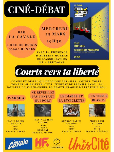 Dans le cadre de la Fête du Court Métrage 2026, les volontaires en service civique d’Unis Cité, HF+ Bretagne et Clair Obscur co-organisent et co-animent un ciné-débat au bar La Cavale !